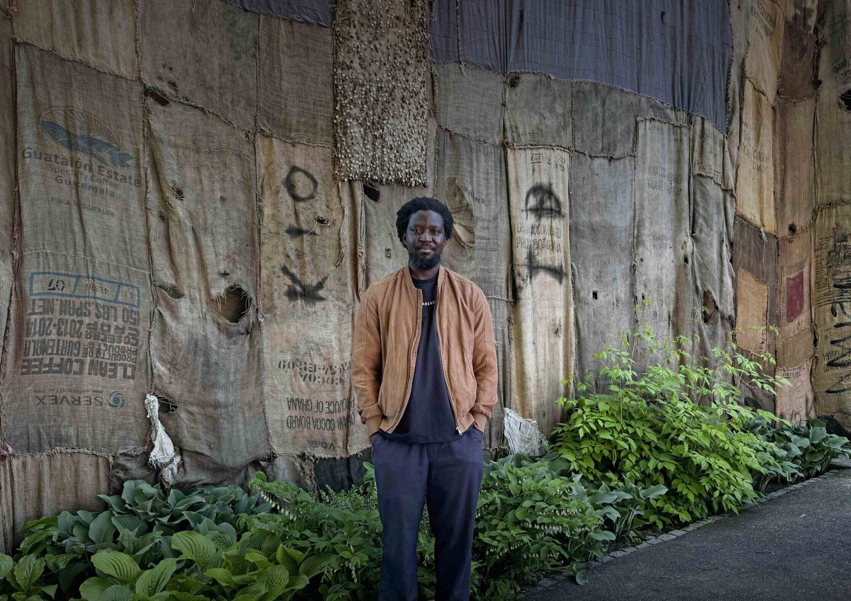 Born in 1987 in Tamale, Ghana, Ibrahim Mahama is internationally acclaimed for his large-scale installations utilizing repurposed materials — particularly jute sacks formerly used to transport commodities like cocoa, rice, and charcoal. He began working with these materials in 2011, inspired by the unequal mobility of goods and people across Ghana’s borders.