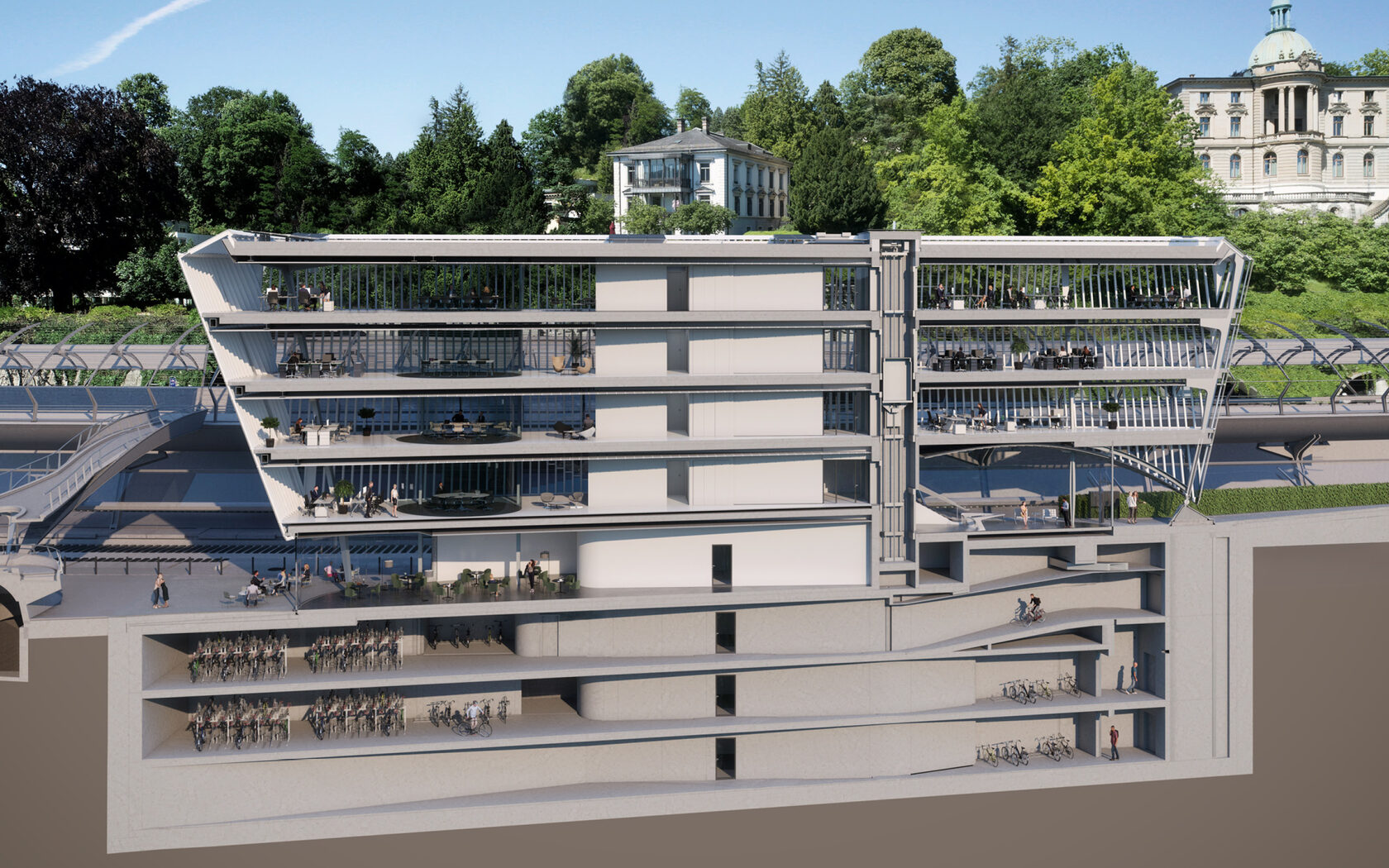 The development boasts an impressive array of public amenities, including a state-of-the-art bicycle station in the basement capable of accommodating up to 800 bikes, while its strategic location provides direct access to the train platforms.